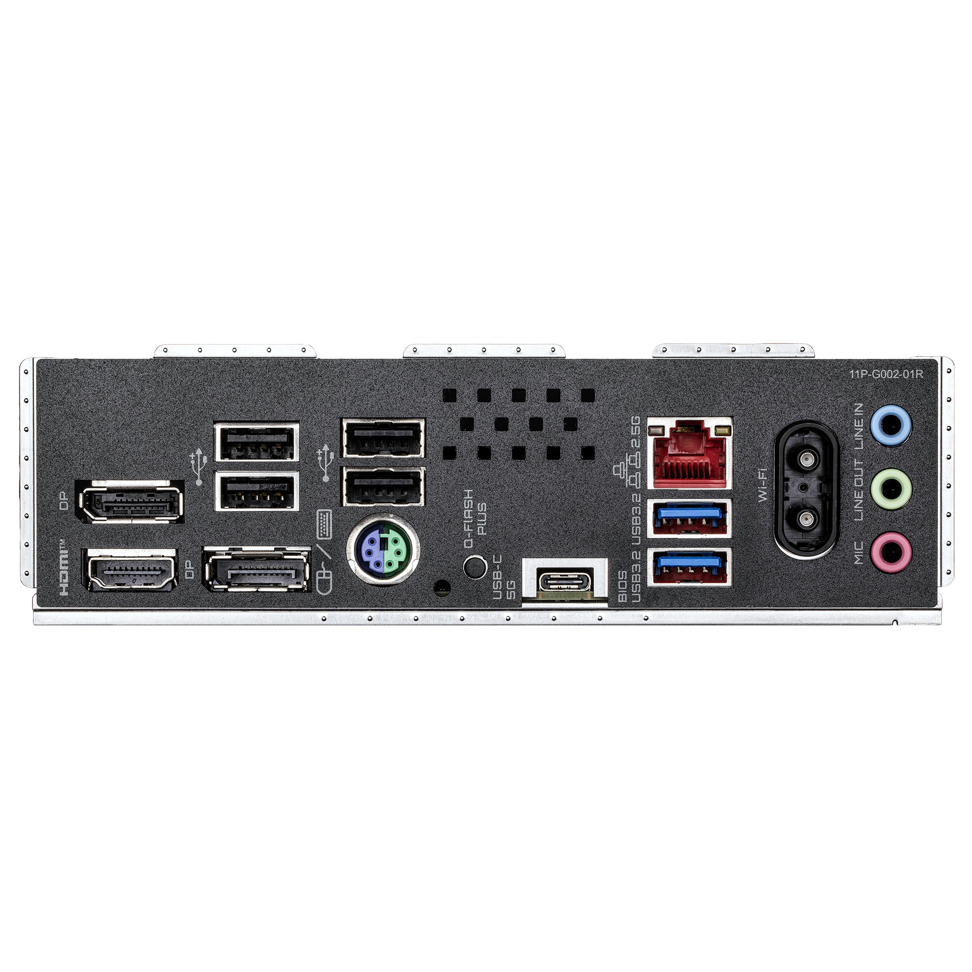 Porty na zadním panelu: * 1x HDMI * 2x DisplayPort * 1x tlačítko Q-Flash Plus * 1x PS/2 pro klávesnici/myš * 1x USB-C® s podporou USB 3.2 Gen 1 * 2x USB 3.2 Gen 1 * 4x USB 2.0/1.1 * 2x anténní konektor (1T1R) * 1x RJ-45 * 3x audio konektor
