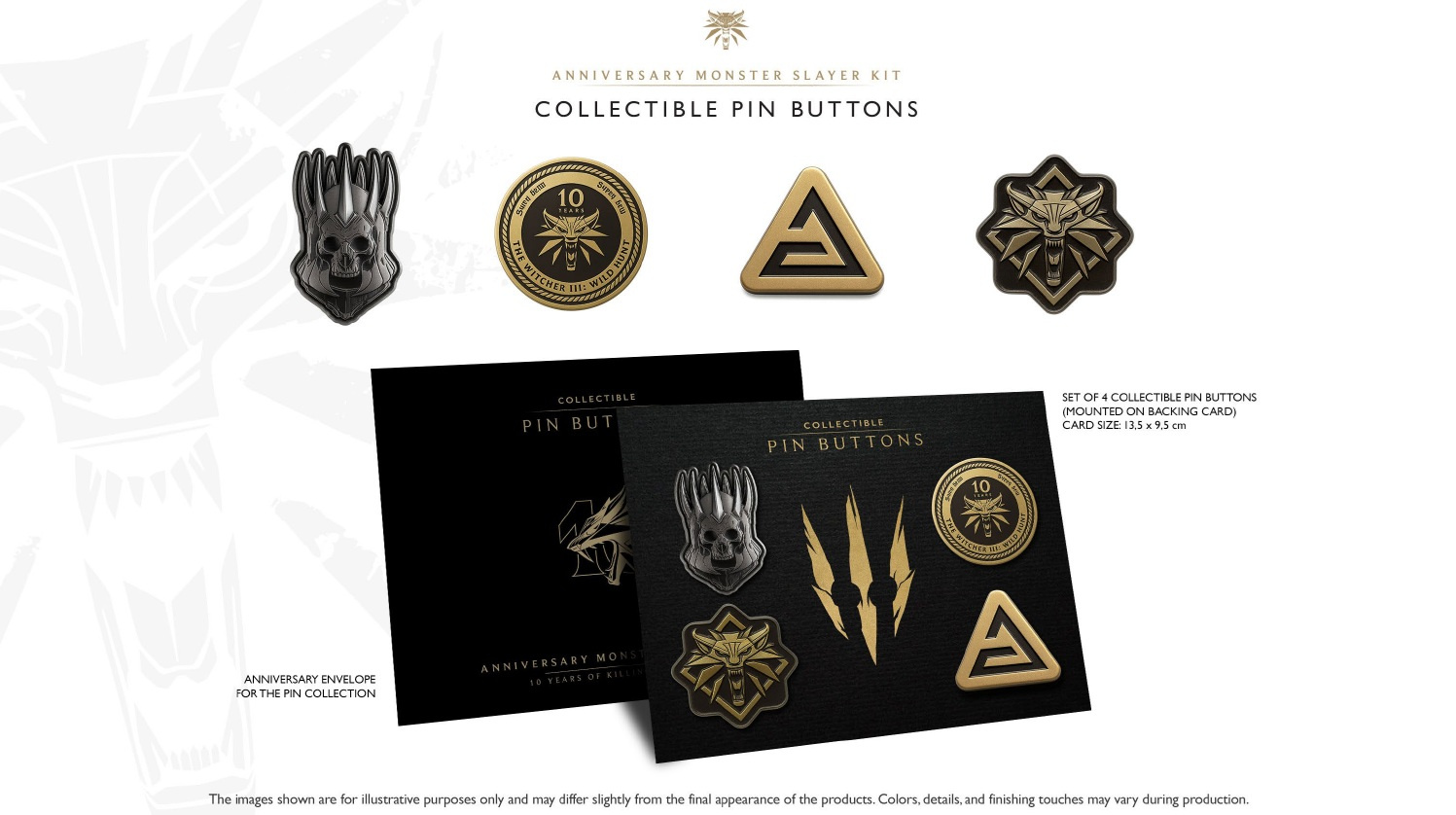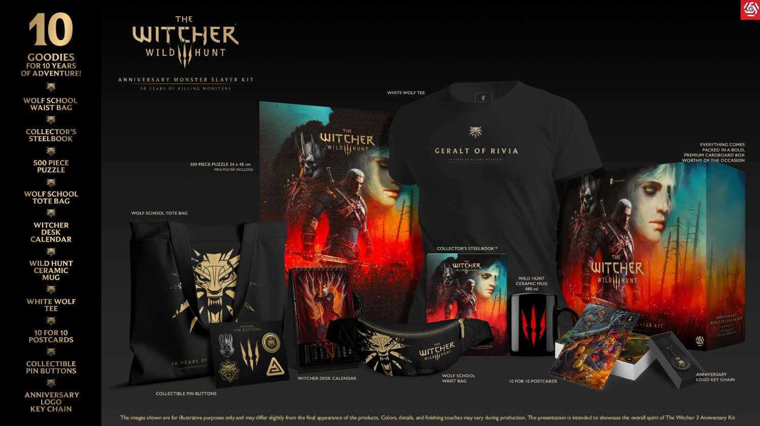 *Tašku Vlčí školy, s rozměry 42 x 46 x 11 cm. Je navržená tak, aby byla odolná a dostatečně prostorná pro každodenní použití. *Ledvinku Vlčí školy potištěnou luxusní metalickou zlatou barvou. *Sběratelský steelbook, který má na přední straně vyobrazeného Geralta a Ciri a na zadní straně je znak vlčí školy. *Puzzle o 500 dílcích s rozměry 34 x 48 cm. Součástí balení je navíc praktický mini-plakát, který poslouží jako předloha. *Stolní kalendář Zaklínače , který má spirálovou vazbu a rozměry 12 x 21,5 cm. *Termoaktivní keramický hrnek o objemu 480 ml. Na jedné straně je stálý potisk, zatímco druhá strana mění design při nalití horkého nápoje. *Tričko Bílého Vlka (White Wolf), které je v jedné velikosti L (pánské). Je potištěné lesklou metalickou zlatou barvou a vyobrazuje Geralta z Rivie. *Sadu 10 pohlednic, které jsou v elegantní obálce se zlatým potiskem. *Sadu 4 sběratelských odznaků, které jsou upevněny na podkladové kartě.