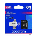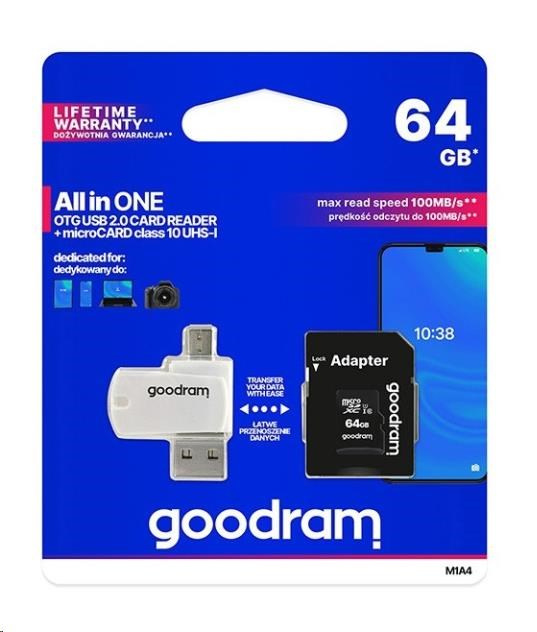 GOODRAM M1A4 All in One poskytuje všestrannosť tým, že poskytuje funkčnosť viacerých zariadení v jednom riešení. Ide o čítačku kariet vybavenú konektormi USB 2.0 a micro USB, umožňujúcu jednoduchý prenos dát medzi počítačmi, smartphonmi, tablety a fotoaparátmi. Dodáva sa s rýchlou UHS-I microSD kartou.