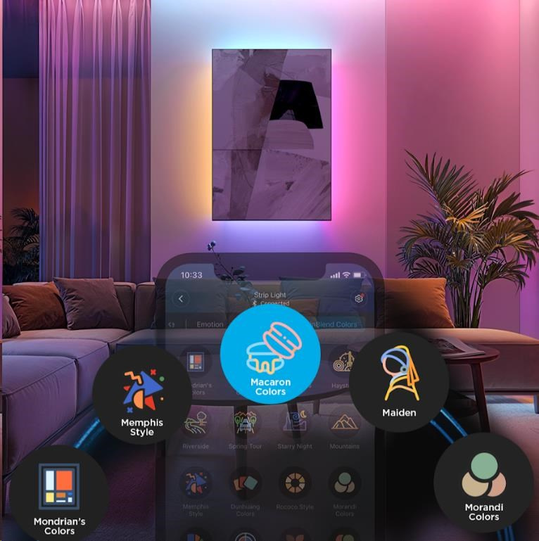 Pokročilý DIY režim LED Strip Light 2 Pro umožňuje vytvárať vlastné svetelné efekty, zatiaľ čo desiatky prednastavených scén vám poskytujú okamžitú inšpiráciu pre rôzne príležitosti – od relaxačného večera po energickú párty. Každá scéna je navrhnutá tak, aby maximálne využila možnosti plynulých prechodov farieb a dynamických efektov. So 16 miliónmi farieb si môžete hrať s nekonečnými kombináciami, ktoré sa dokonale prispôsobia akejkoľvek atmosfére. Synchronizácia s hudbou navyše zabezpečuje, že svetlá oživí každý rytmus a zvýši zážitok z počúvania.