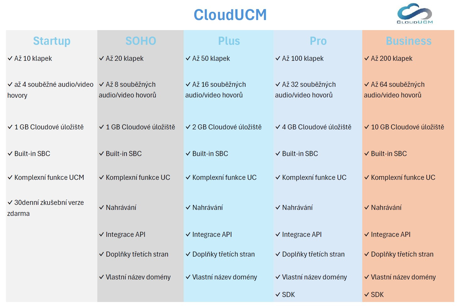 - Až 20 klapek - Až 8 souběžných audio/video hovorů - 1 GB Cloudové úložiště - Built-in SBC - Komplexní funkce UC - Nahrávání - Integrace API - Doplňky třetích stran - Vlastní název domény
