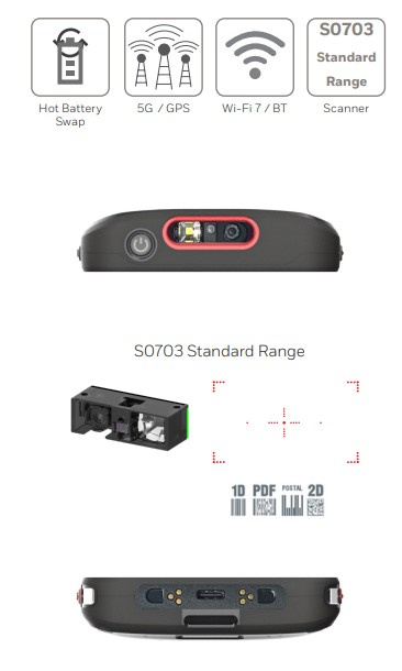 Popis Honeywell CT70: WIFI7/6E, 8GB/128GB, Štandard Range Engine-Red Laser, Extended Battery, GMS
