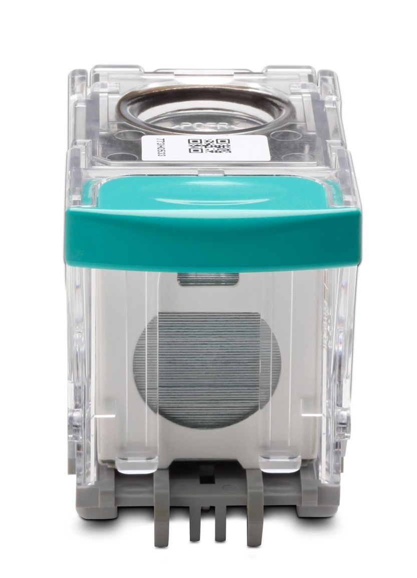 Zabraňte přerušení pracovních úloh pomocí doplňku kazet HP se svorkami. S 5 000 sponkami v náplňové kazetě a zprávami, které indikují, kdy sešívačce dochází zásobník, nemusíte se obávat, že by se uprostřed tisku došly spony.