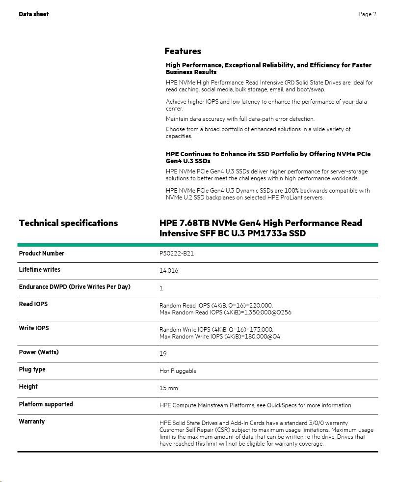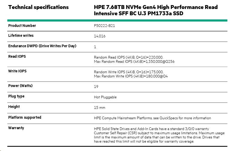 HPE 7.68TB NVMe Gen4 High Performance Read Intensive SFF BC U.3 PM1733a SSD P50222-B21 RENEW.