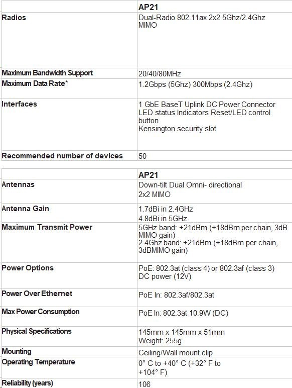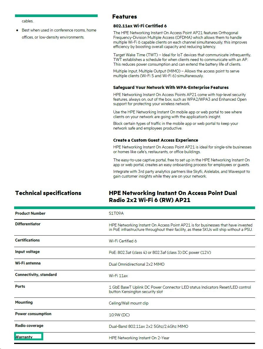 • The HPE Networking Instant On Access Point AP21 is a dual radio indoor access point designed to bring connectivity to small spaces. This Wi-Fi CERTIFIED™ 6 access point offers modern WI-Fi standards in a small footprint to enhance the connectivity of your network for up to 50 devices. The dual-band radios offer suitable range for a 1500 sq ft space at an affordable price with the same features as other more costly access points. The HPE Networking Instant On AP21 can also be used with Smart Mesh with any other Instant On access point to extend your network coverage without needing to run new cables—HPE Networking Instant On AP21, small yet mighty coverage for your growing wireless needs.