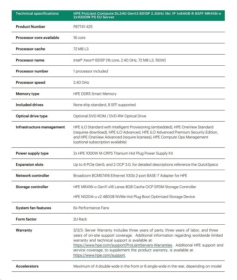 HPE PL DL340g12 6515P (2.4/16C) 1x64G (P69728) NS204(2x480) MR416i-o 8SFF 2x1000W 2p10Gsfp+ PerfFans NBD333 Smart Choice