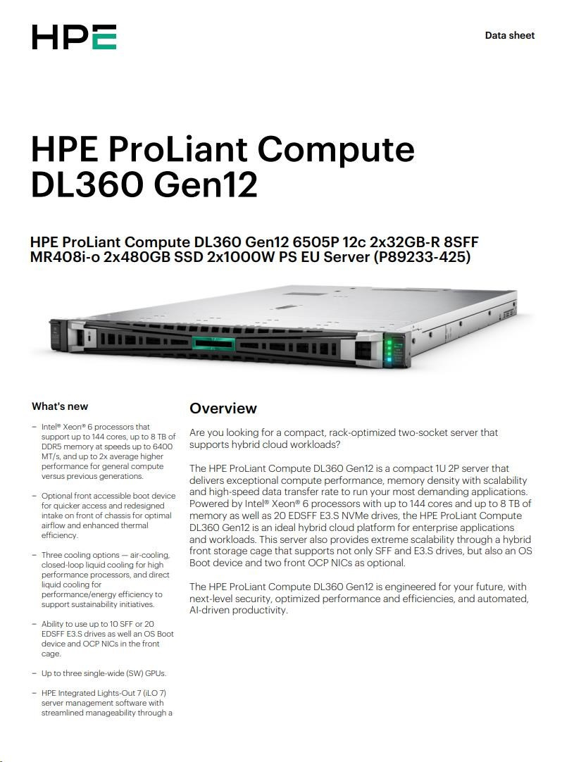 HPE PL DL360g12 6505P (2.2G/12C) 2x32G (P69727) 2x2.4TB MR408i-o 8SFF 2x1000W 2p10GbE NBD333 Smart Choice.