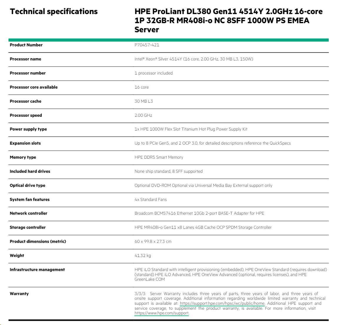 | Warranty | Server warranty includes 3-year parts, 3-year labor, 3-year onsite support with next business day response. | |