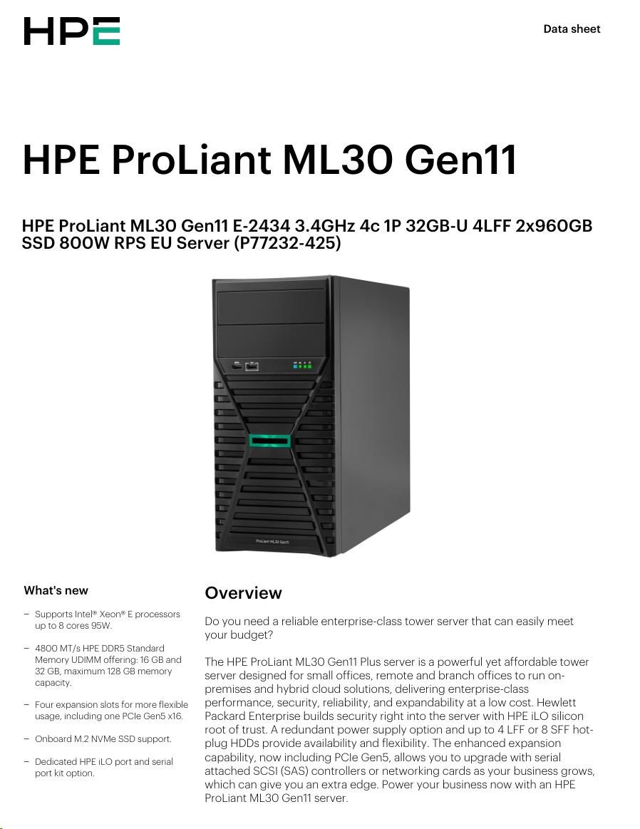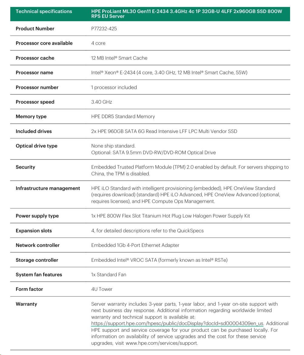 HPE ProLiant ML30 Gen11 E-2434 3.4GHz 4c 1P 32GB-U 4LFF 2x960GB SSD 800W RPS EU Server