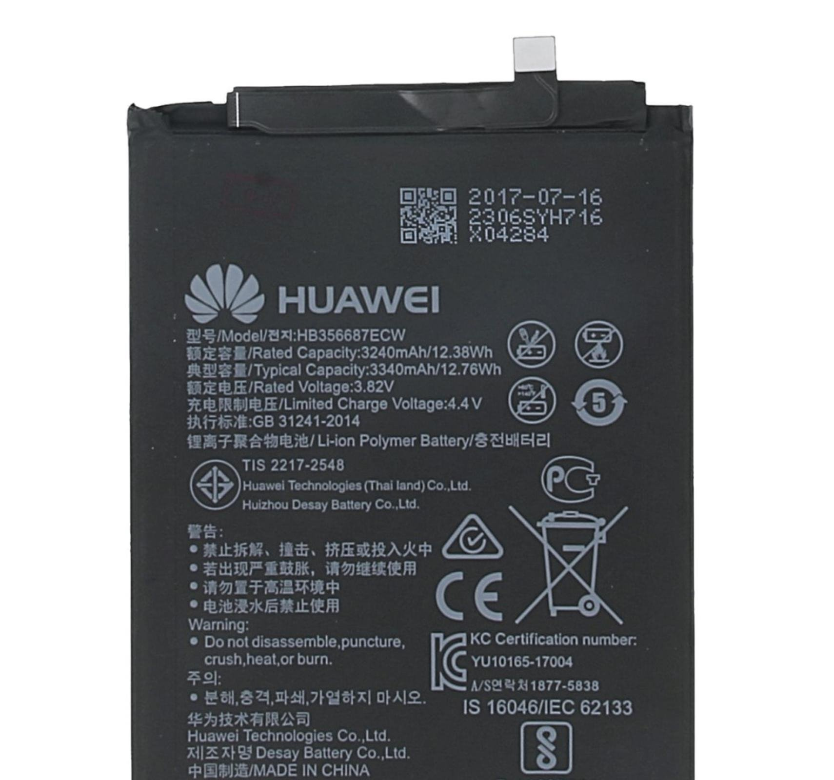 Kvalitní originální náhradní baterie značky Huawei (HB356687ECW) pro mobilní telefony Honor 7X, Huawei Nova 3i (P Smart Plus), Huawei Mate 10 Lite o kapacitě 3 340 mAh.