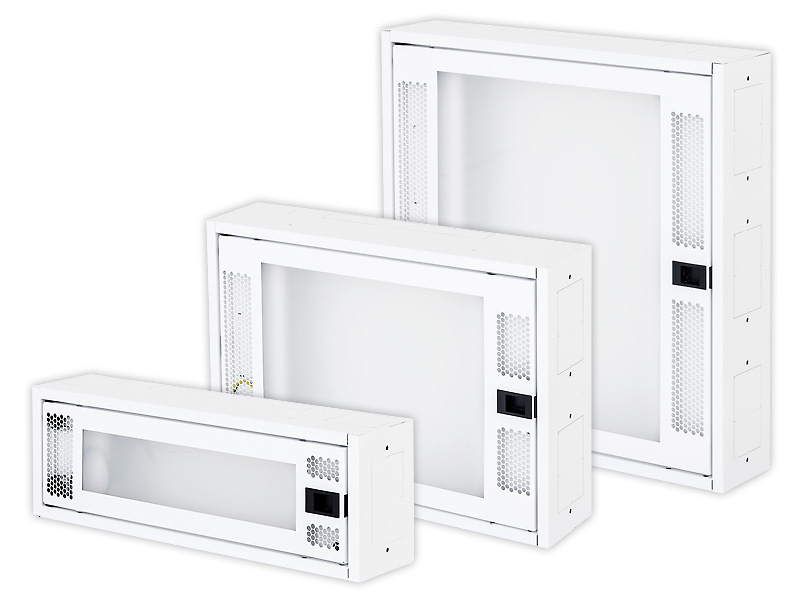 Hybridní rozvaděč RNA Datový rozvaděč RNA s plochými dveřmi (verze -X2 na konci kódu) byl vyvinut pro instalaci v místech, kde není možno těžit z výhod které přináší standardní model tohoto rozvaděče. Celková hloubka rozvaděče včetně dveří u této modifikace dosahuje pouze 110 mm. Použití plochých dveří přináší některá omezení. Držák keystonů pro osazení datových rozvodů je zde kolmo na plastovou montážní desku a kabely tak více zasahují do prostoru určeného pro instalaci aktivních prvků. Také část určená pro rozvod napájení se liší od základního modelu. *IP20 / IK05 *Rozvaděč se věší přímo na zeď, případně jej lze osadit do připraveného otvoru ve zdi. *Určen k samostatné montáži či v kombinaci s rozvaděčem typu SNA. *Kabelové vstupy na horní, spodní a obou bočních stěnách rozvaděče umožňují jeho spojování do větších sestav s ostatními rozvaděči této řady včetně elektro rozvaděčů typu SNA. *Svařovaný skelet z plechu tloušťky 1 mm v kombinaci s plastem PEHD 8 mm. *Rám rozvaděče a všechny oddělitelné části (boční a zadní kryty, dveře…) jsou pospojeny pomocí propojovacích kabelů, které musí být důkladně připevněny a zasunuty do konektorů po celou dobu užívání rozvaděče. *Na spodní části rozvaděče je umístěn šroub M8 pro připojení pospojení. *Po obvodu rozvaděče jsou připraveny záslepky k vylomení. *Maximální dovolené zatížení rozvaděče 20 kg, dveří 2 kg.