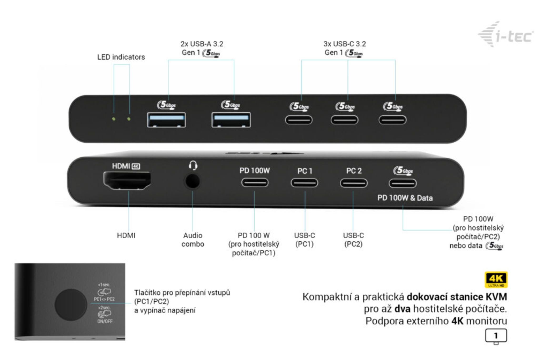 Popis i-tec KVM Docking Station HDMI pre 2 hosty, Power Delivery 2x 100W