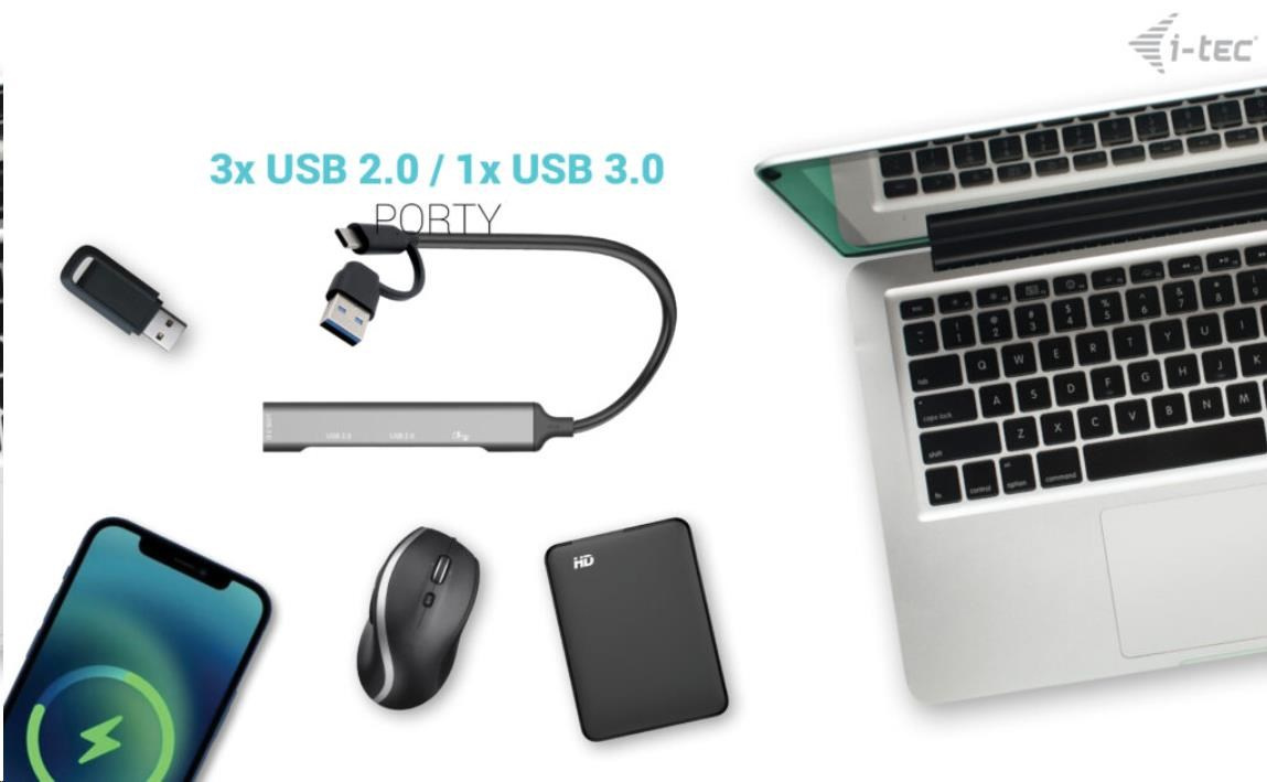 S týmto rozbočovačom získate 4 ďalšie porty USB: štandardný port USB 3.0 a tri porty USB 2.0. V prípade potreby môžete využiť aj ďalšie porty USB. Pripojte externú klávesnicu a myš, prenášajte dáta alebo filmy z flash disku USB rýchlosťou až 5 Gb/s alebo nabíjajte svoj mobilné zariadenia (štandardná rýchlosť USB 0,9 A).