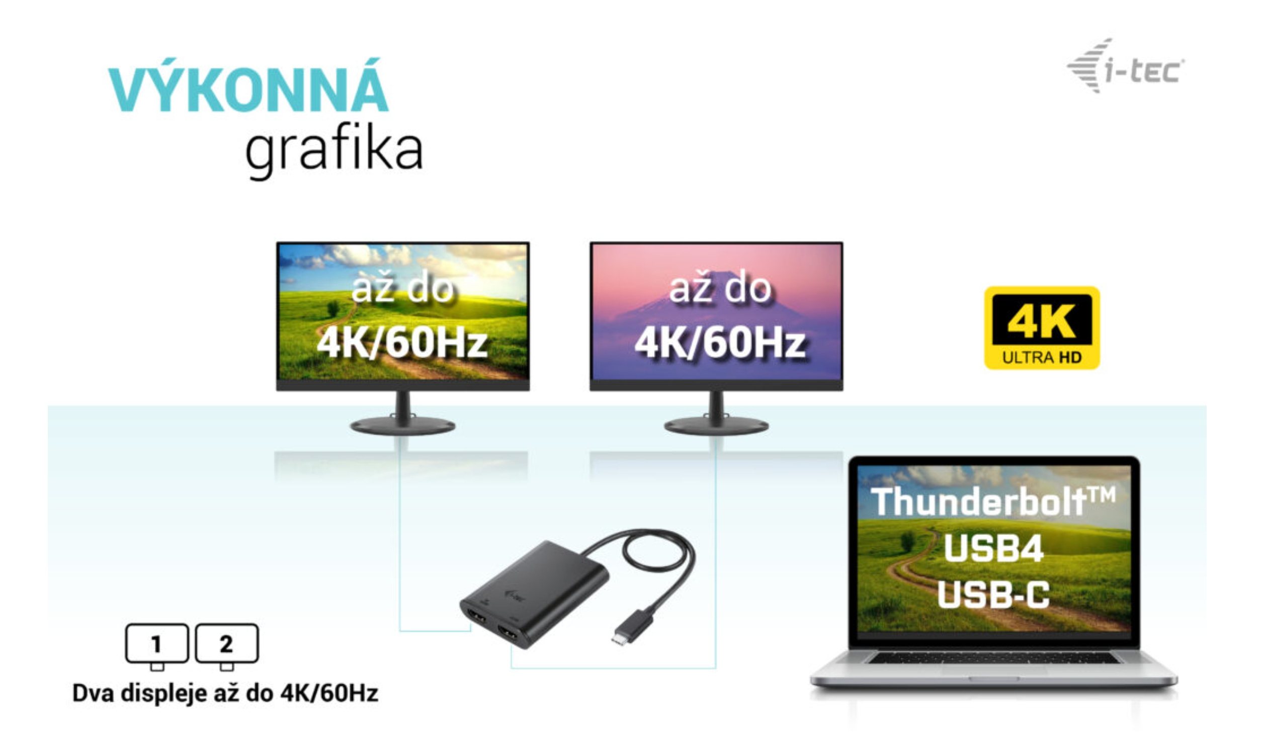 • Výkonný videoadaptér USB-C, ke kterému lze připojit až dva monitory současně