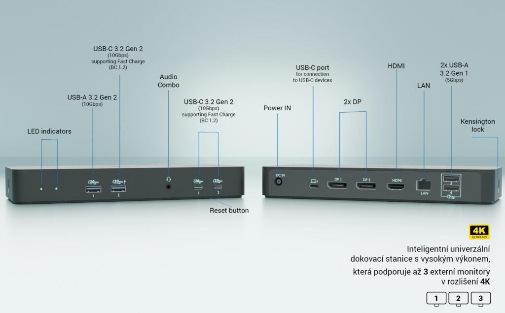 Vysoko výkonná dokovacia stanica novej generácie s USB-C, ktorá podporuje pripojenie až troch externých monitorov v rozlíšení až 4K. Môže byť použitá s takmer akýmkoľvek notebookom vybaveným portami USB-C, USB4 alebo Thunderbolt™ 3/4/5 a zároveň podporuje všetky bežné aktuálne operačné systémy.