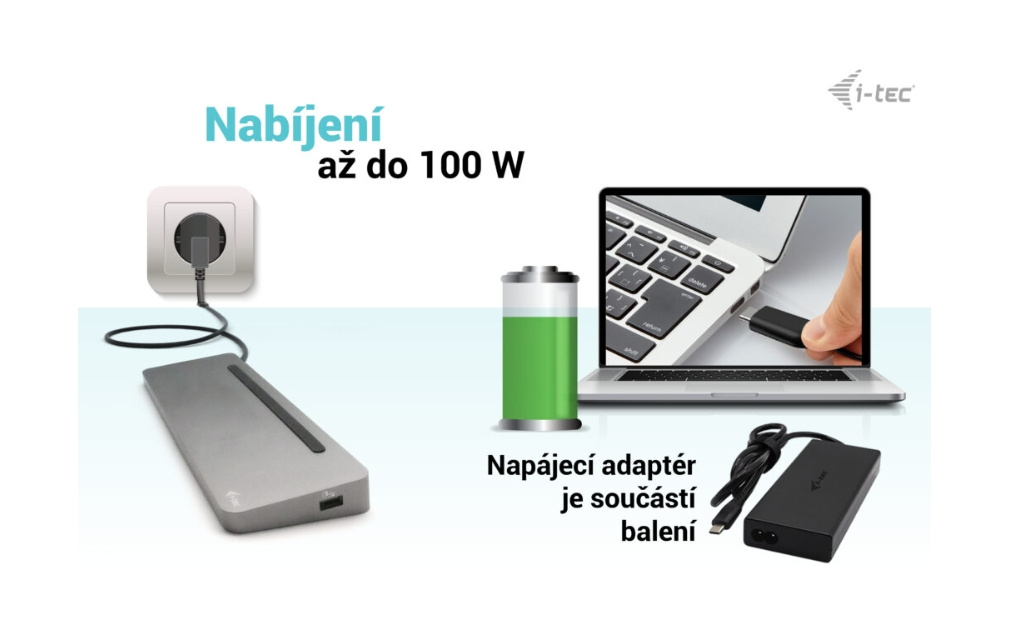 • Univerzální napájecí adaptér USB-C s výkonem 100 W pro napájení notebooků, tabletů, chytrých telefonů a dalších zařízení vybavených nabíjecím portem USB-C.