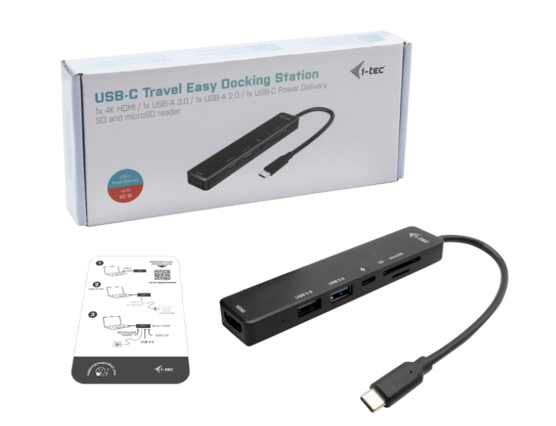 Malá dokovací stanice, která i přes své velmi kompaktní rozměry nabízí vše potřebné pro základní práci. Připojte externí monitor v rozlišení až 4K, dva USB porty poslouží pro připojení vašich periferií a čtečka SD a microSD karet pomůže s přenosem dat. Samozřejmostí je i možnost napájení vašeho notebooku, a to až do 60 W (napájecí adaptér můžete buď použít svůj stávající, případně si nabíječku dokoupit : https://i-tec.pro/produkty/?catg=nabijecky-a-baterie&kon=USB-C).