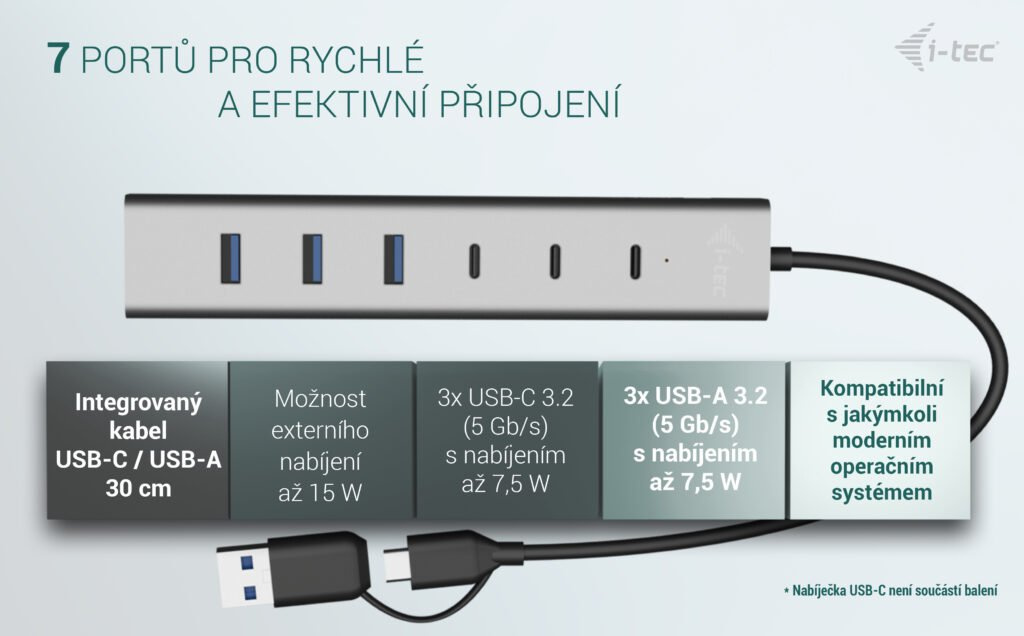 • Nabíjecí HUB USB-A/USB-C, až pro 7 zařízení