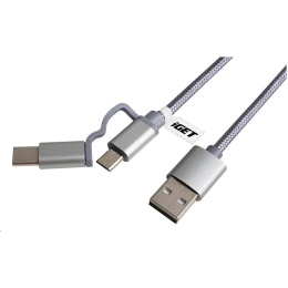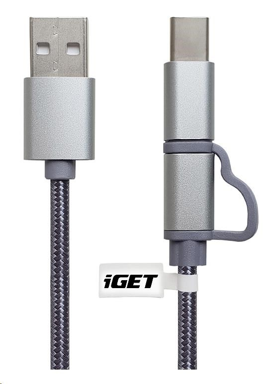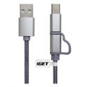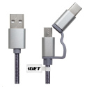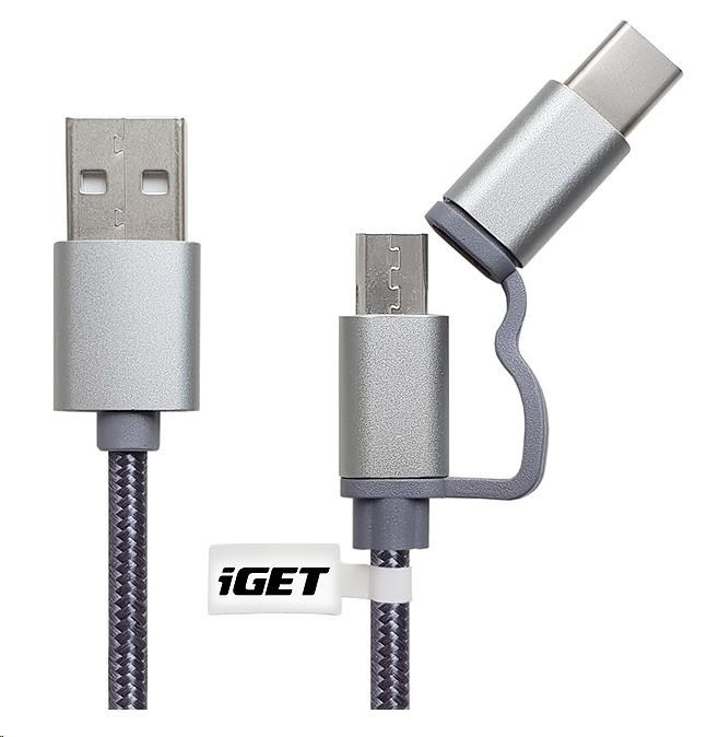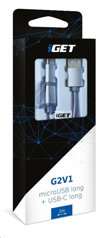 Popis iGET G2V1 USB kábel 2v1, 1 m, strieborný, microUSB a USB-C, predĺžené konce