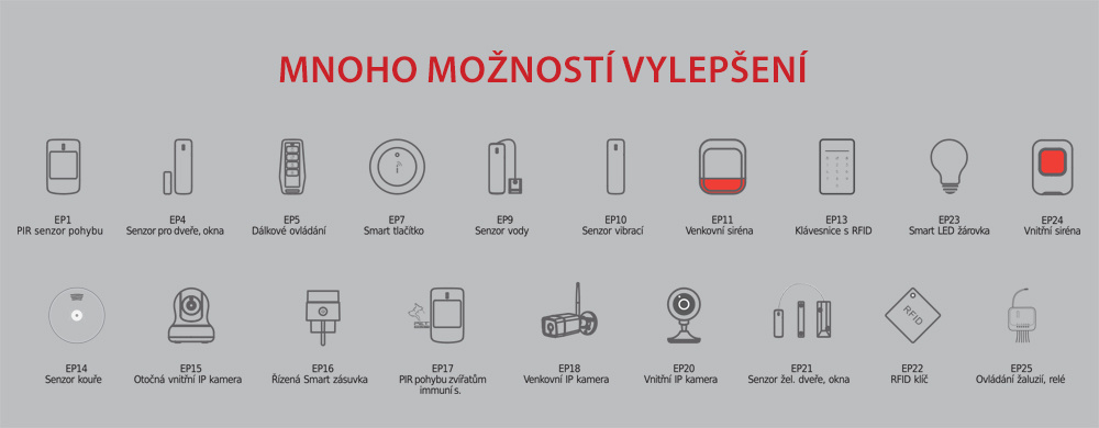 - Ovládá vnitřní i venkovní IP kamery, spíná řízené zásuvky 230V, a komunikuje s dalšími více než 20-ti typy bezdrátového příslušenství, označené jako iGET SECURITY EPxx.