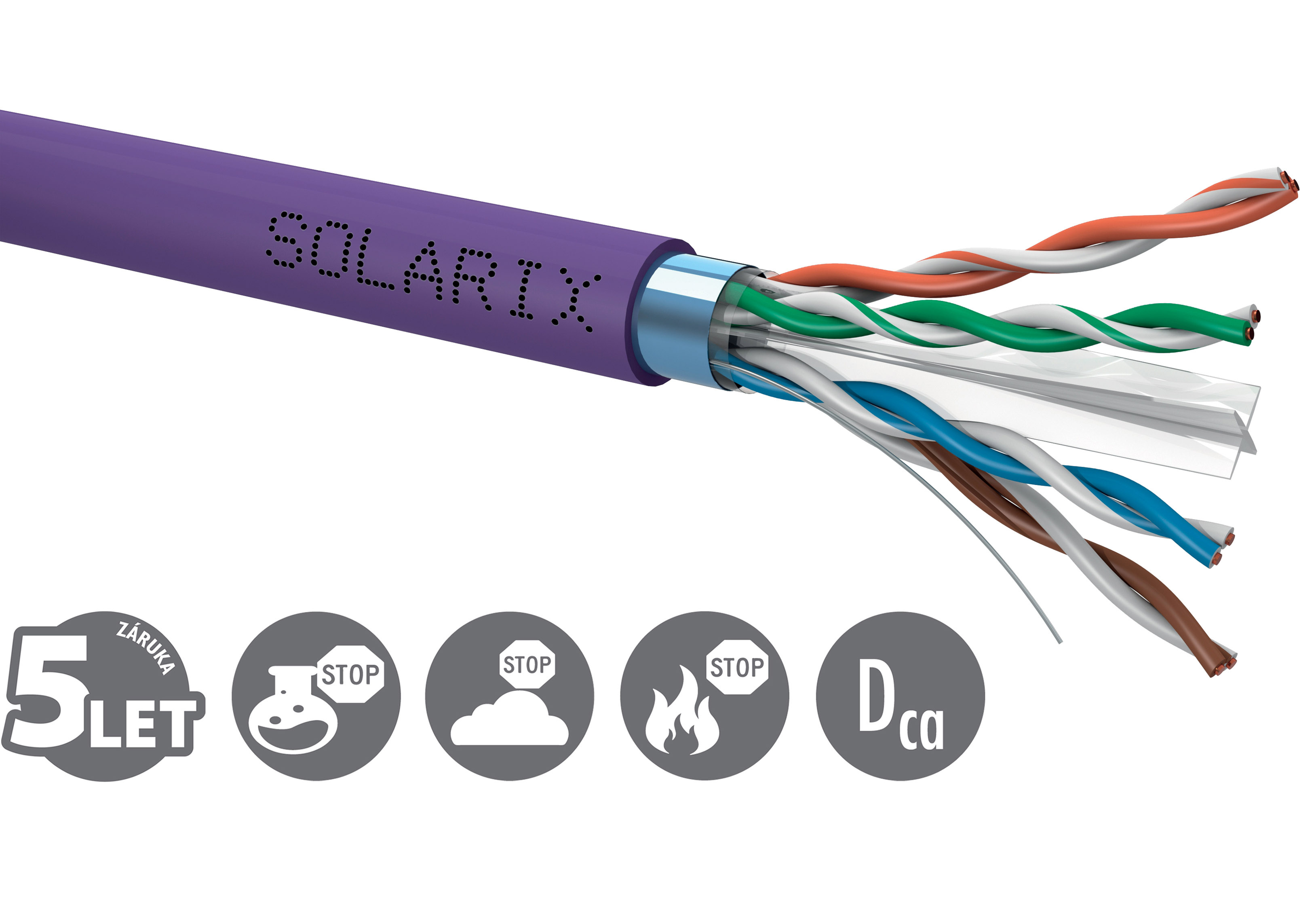 Instalační kabel Solarix s označením SXKD-6-FTP-LSOH je spolehlivý stíněný kabel kategorie 6, který je určený pro provoz ethernetových protokolů, včetně 2.5GBASE-T a 5GBASE-T. Konstrukce kabelu je F/UTP s plastovým křížem, který zajišťuje maximální oddělení párů od sebe po celé délce kabelu. Typ pláště je LSOH s třídou reakce na oheň Dca-s2,d2,a1. Vodiče kabelu jsou vyrobeny z kvalitního měděného drátu s čistotou mědi 99,97 %. Kabel bez problémů splňuje požadavky z mezinárodních standardů ISO/IEC 11801, EN 50173 a ANSI/TIA 568.2-D. V případě CPR (nařízení EU č. 305/2011) je kabel testován u nezávislé laboratoře FORCE TECHNOLOGY v systému posuzování vlastností AVCP 3. Stejně jako ostatní kabely Solarix, je i kabel SXKD-6-FTP-LSOH značen metráží po 1 m v rozsahu od 0 do 500 m. Kabel je dodáván na vysoce pevné dřevěné cívce, na které jsou uvedeny všechny nezbytné produktové informace, včetně čárových kódů, výrobní šarže, popisu a nejdůležitějších technických parametrů.