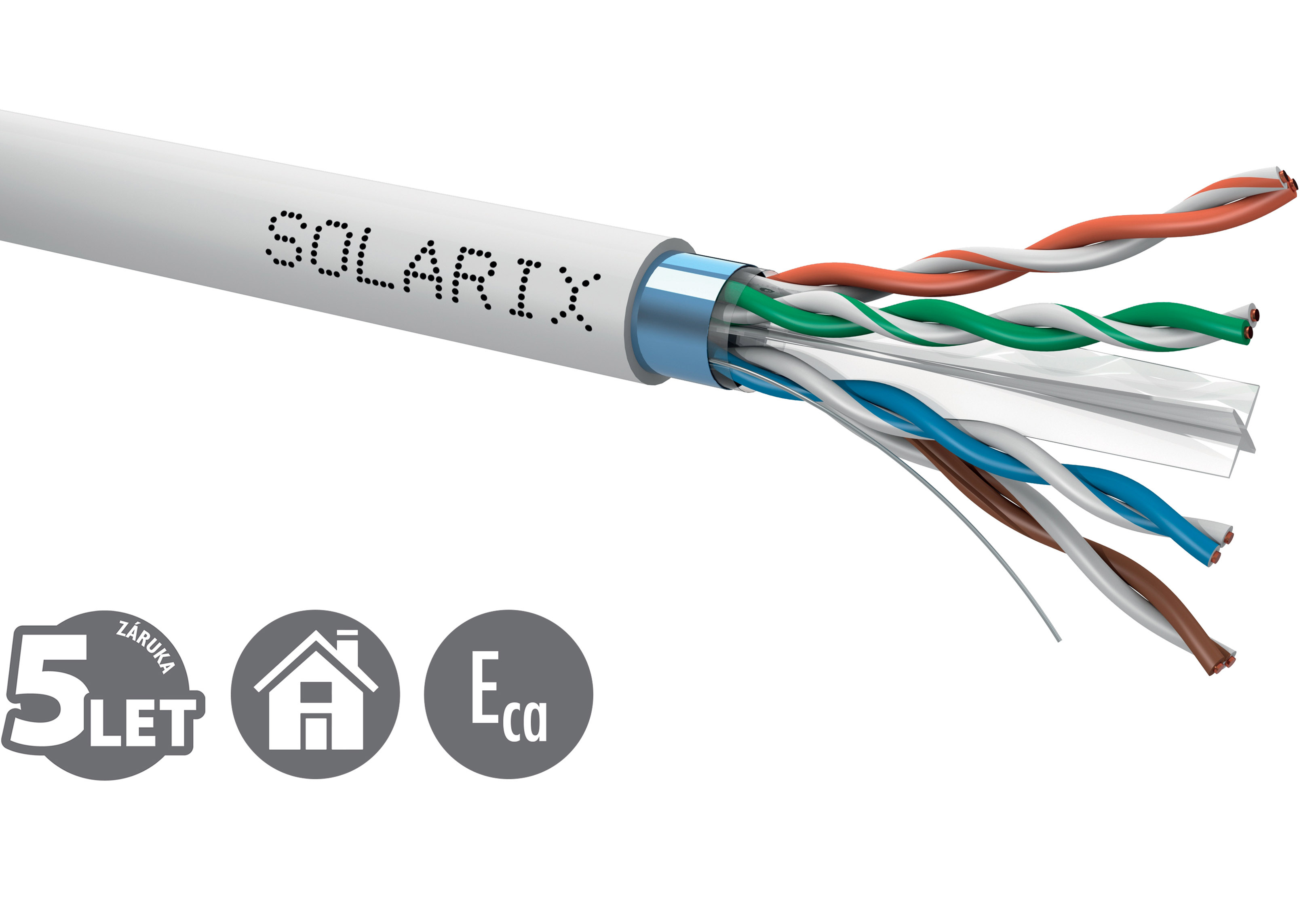Instalační kabel Solarix s označením SXKD-6-FTP-LSOH je spolehlivý stíněný kabel kategorie 6, který je určený pro provoz ethernetových protokolů, včetně 2.5GBASE-T a 5GBASE-T. Konstrukce kabelu je F/UTP s plastovým křížem, který zajišťuje maximální oddělení párů od sebe po celé délce kabelu. Typ pláště je PVC s třídou reakce na oheň Eca. Vodiče kabelu jsou vyrobeny z kvalitního měděného drátu s čistotou mědi 99,97 %. Kabel bez problémů splňuje požadavky z mezinárodních standardů ISO/IEC 11801, EN 50173 a ANSI/TIA 568.2-D. V případě CPR (nařízení EU č. 305/2011) je kabel testován u nezávislé laboratoře FORCE TECHNOLOGY v systému posuzování vlastností AVCP 3. Stejně jako ostatní kabely Solarix, je i kabel SXKD-6-FTP-PVC značen metráží po 1 m v rozsahu od 0 do 500 m. Kabel je dodáván na vysoce pevné dřevěné cívce, na které jsou uvedeny všechny nezbytné produktové informace, včetně čárových kódů, výrobní šarže, popisu a nejdůležitějších technických parametrů.