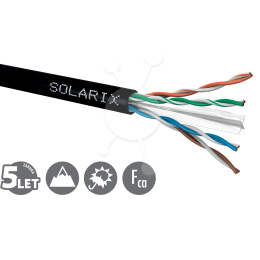 Instalační kabel Solarix s označením SXKD-6-UTP-PE je spolehlivý venkovní nestíněný kabel kategorie 6 který je určený pro provoz ethernetových protokolů, včetně 2.5GBASE-T a 5GBASE-T. Konstrukce kabelu je U/UTP s plastovým křížem, který zajišťuje maximální oddělení párů od sebe po celé délce kabelu. Typ pláště je UV stabilní PE s třídou reakce na oheň Fca a stupněm krytí IP67. Vodiče kabelu jsou vyrobeny z kvalitního měděného drátu s čistotou mědi 99,97 %. Kabel bez problémů splňuje požadavky z mezinárodních standardů ISO/IEC 11801, EN 50173 a ANSI/TIA 568.2-D. Stejně jako ostatní kabely Solarix, je i kabel SXKD-6-UTP-PE značen metráží po 1 m v rozsahu od 0 do 500 m. Kabel je dodáván na vysoce pevné dřevěné cívce, na které jsou uvedeny všechny nezbytné produktové informace, včetně čárových kódů, výrobní šarže, popisu a nejdůležitějších technických parametrů. Tento kabel není určen pro trvalé uložení do vody ani do země bez odpovídající řádné ochrany.