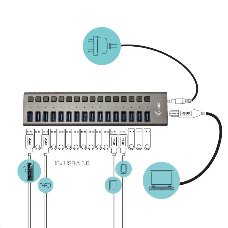 Tento HUB ponúka 16 USB 3.0 s funkciou Plug & Play a štandardným nabíjaním cez USB - HUB automaticky rozpozná, či je pripojené nabíjacie zariadenie USB. Vďaka tomu, že HUB má 16 USB 3.0, naraz možno nabíjať až 16 zariadení. USB 3.0 je dôležitý najmä pri prenose dát z USB 3.0 pamäťových kariet a flash diskov, kde je jeho vysoká prenosová rýchlosť najužitočnejšia. Súčasťou balenia je externý napájací adaptér, ktorý zabezpečuje stabilné nabíjanie z portov USB a napájanie rozbočovača a poskytuje až 10 W nabíjacieho výkonu na port.