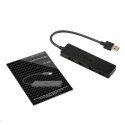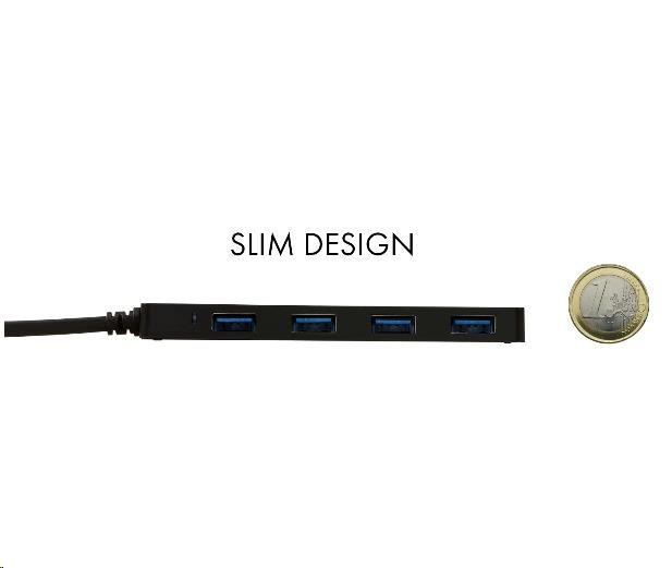 Tento HUB ponúka štyri USB 3.0 s funkciou Plug & Play a štandardným nabíjaním cez USB - HUB automaticky rozpozná, či je pripojené nabíjacie zariadenie USB. USB 3.0 je dôležitý najmä pri prenose dát z USB 3.0 pamäťových kariet a flash diskov, kde je jeho vysoká prenosová rýchlosť najužitočnejšia. LED dióda zobrazuje stav čítania a zápisu údajov.