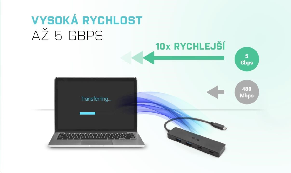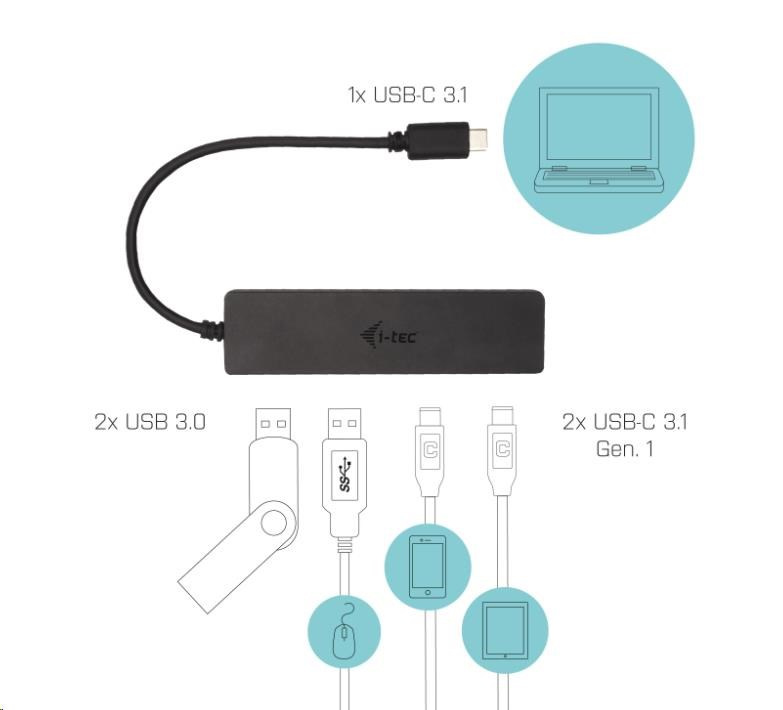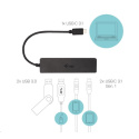 S týmto rozbočovačom získate 4 ďalšie USB: dve štandardné USB 3.0 a dva porty USB-C. Pripojte externú klávesnicu a myš, prenášajte dáta alebo filmy z flash disku USB rýchlosťou až 5 Gb/s alebo nabíjajte mobilné zariadenia (štandardná rýchlosť USB 0.9A).