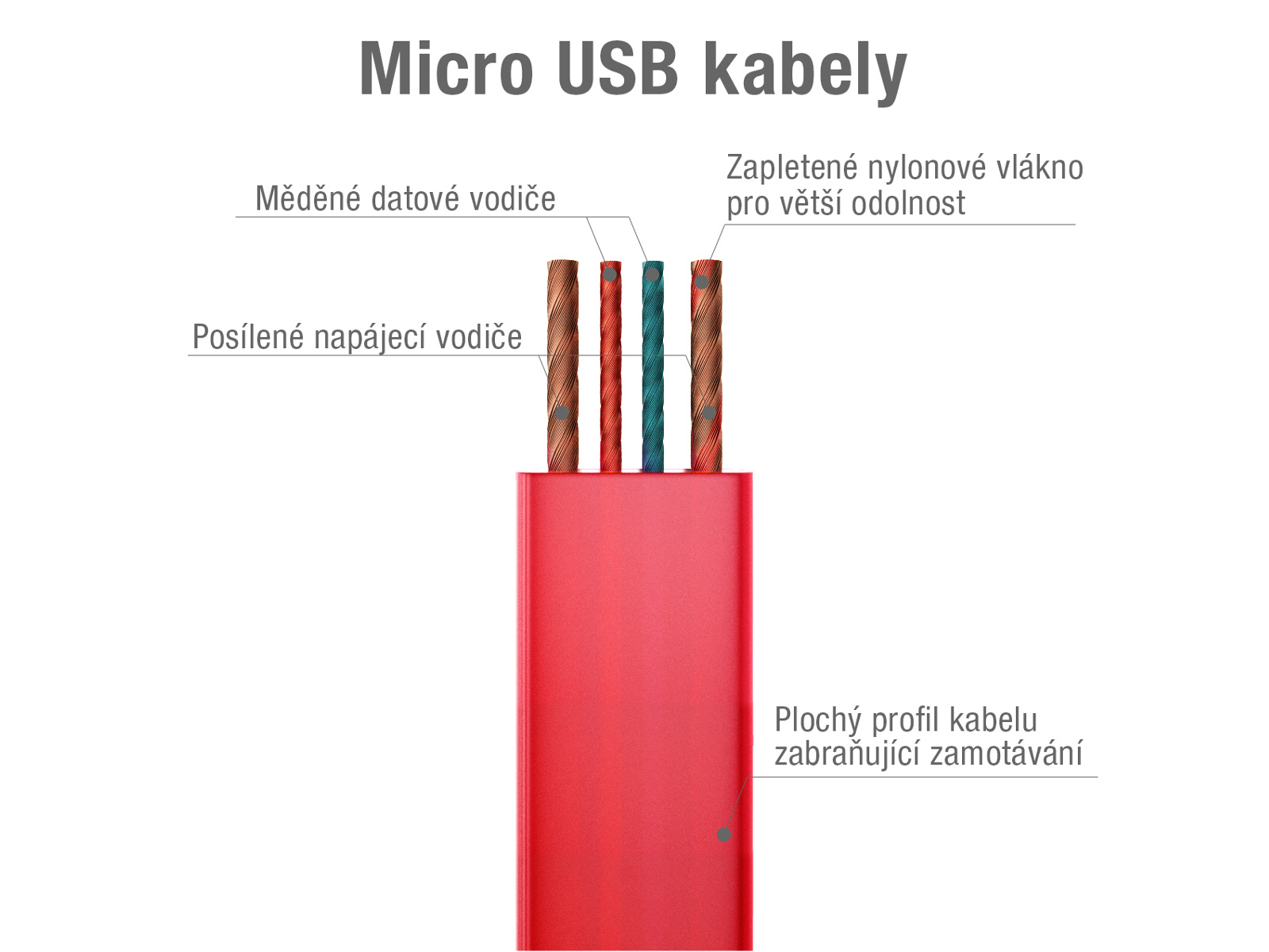 Zesílené vodiče pro rychlejší nabíjení. Samostatně odstíněné datové vodiče pro rychlý a bezproblémový přenos dat.