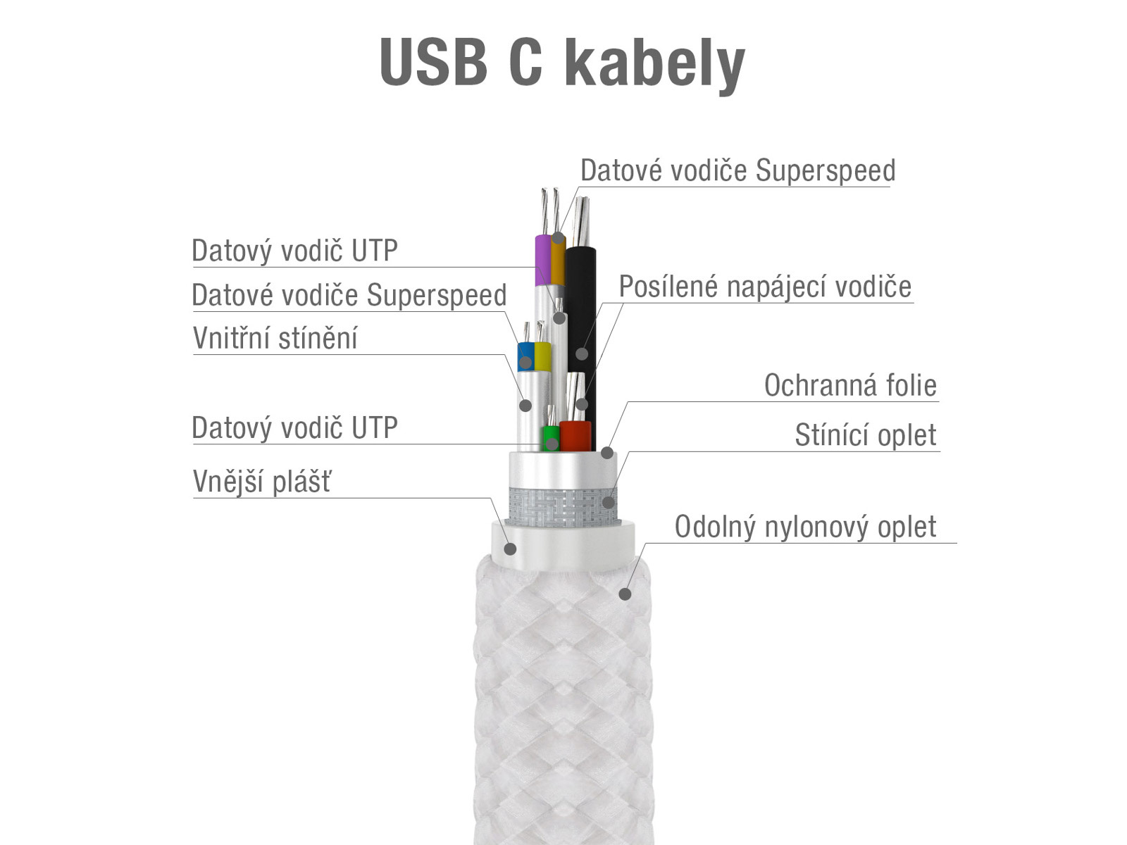 Zesílené proudové vodiče pro rychlé nabíjení. Samostatně odstíněné datové vodiče pro bezproblémový a rychlý přenos dat.