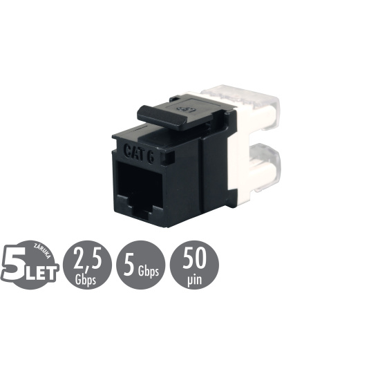 Kategorie: CAT6 Podporované protokoly: 2.5G/5GBASE-T a nižší Min. životnost portu: 1 000 zapojení/odpojení Krytí kontaktů: 50 µ zlata a 100 µ niklu Svorkovnice: duální 110/Krone 8p8c Min. životnost svorkovnice: 200 zařezání Velikost a typ vodiče: AWG 26 - 22, drát Materiál nekovových částí: FR plast podle UL94-0 Barva: černá Skladovací teplota: -40 až 70 °C Provozní teplota: -10 až 60 °C Max. provozní vlhkost: 93 % Balení: 1 ks, plastový sáček Rozměry balení (výška x šířka x hloubka): 145 mm x 90 mm x 20 mm Přepravní balení: 300 ks, kartónový box