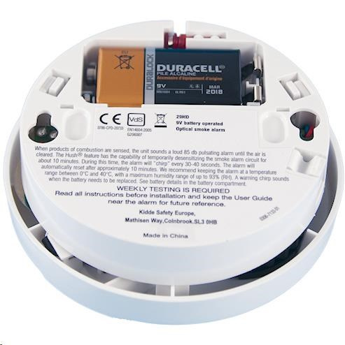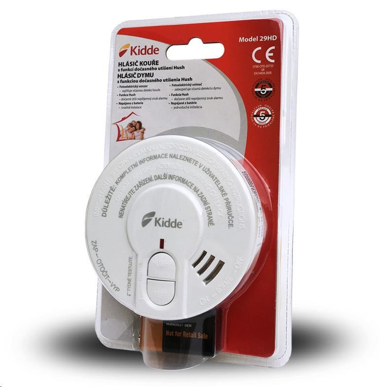 Hasiaci prístroj je vybavený testovacím tlačidlom TEST na kontrolu správneho fungovania zariadenia a HUSH na krátkodobé umlčanie požiarnej signalizácie v prípade planého poplachu. Stlačenie tlačidla spôsobí okamžitú deaktiváciu alarmu na približne 10 minút, zníženie citlivosti obvodov a vypnutie akustickej signalizácie hlásiča. Tlačidlo HUSH používajte iba v prípade, že poznáte príčinu aktivácie hlásiča (napr. pri varení alebo smažení). Po cca 10 minútach od deaktivácie sa hlásič automaticky resetuje do pôvodného nastavenia na monitoring požiarneho nebezpečenstva. Ak v miestnosti zostane vysoká koncentrácia koure, môžete tlačidlo HUSH opakovane stláčať, až kým miestnosť nebude riadne vyvetraná. Tento model je vybavený najmodernejším fotoelektrickým senzorom Kidde.