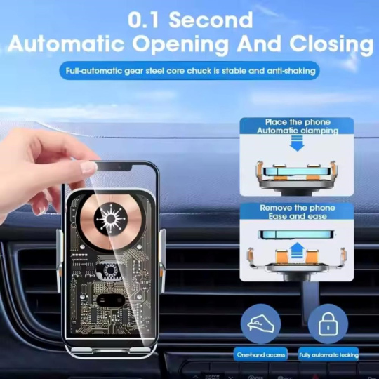 C10 Kvalitná hliníková bezdrôtová inteligentná nabíjačka do auta s optickým senzorom pre automatické roztiahnutie pri vkladaní telefónu a dotykovým senzorom pre otvorenie držiaka pri vybratí. Vybavená je držiakom s kĺbovou aretáciou na uchytenie do ventilácie.