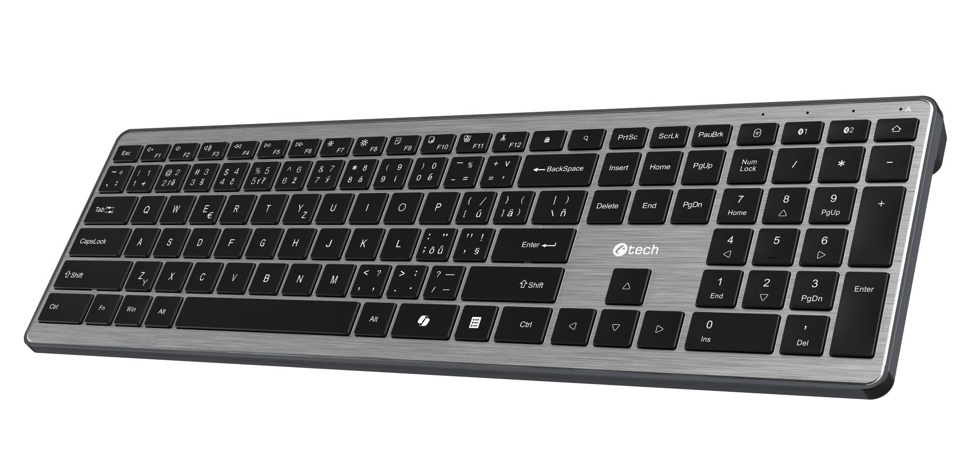 Bezdrátová klávesnice 111 kláves (Scissors spínače) 12 rychlých voleb Připojení Bluetooth/2.4Ghz Rozhraní USB 2.0, dosah až 10m Napájení 2x 1,5V AAA Plug and Play Podpora Win10/11, Android Rozměry : 428 x 128 x 20mm Váha : 550g