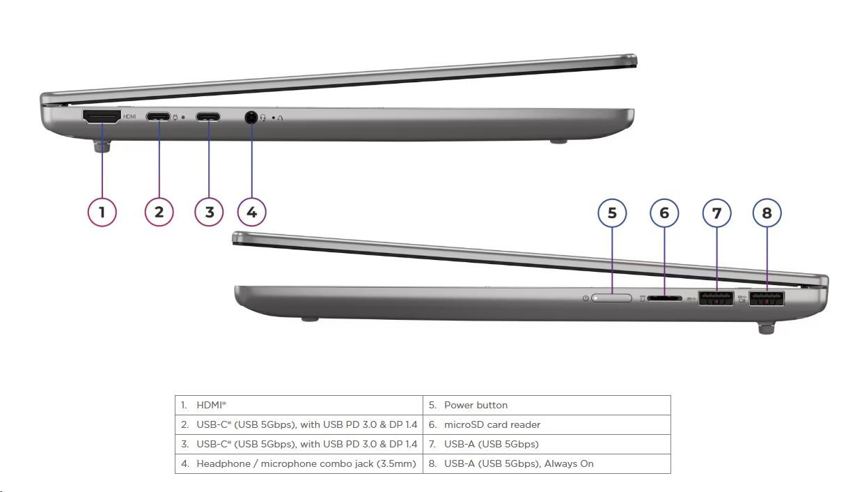 | Standartné porty | 1x USB-A (USB 5Gbps / USB 3.2 Gen 1) 1x USB-A (USB 5Gbps / USB 3.2 Gen 1), Always On 2x USB-C® (USB 5Gbps / USB 3.2 Gen 1), with USB PD 3.0 and DisplayPort™ 1.4 1x HDMI® 1.4b 1x Headphone / microphone combo jack (3.5mm) 1x microSD card reader |