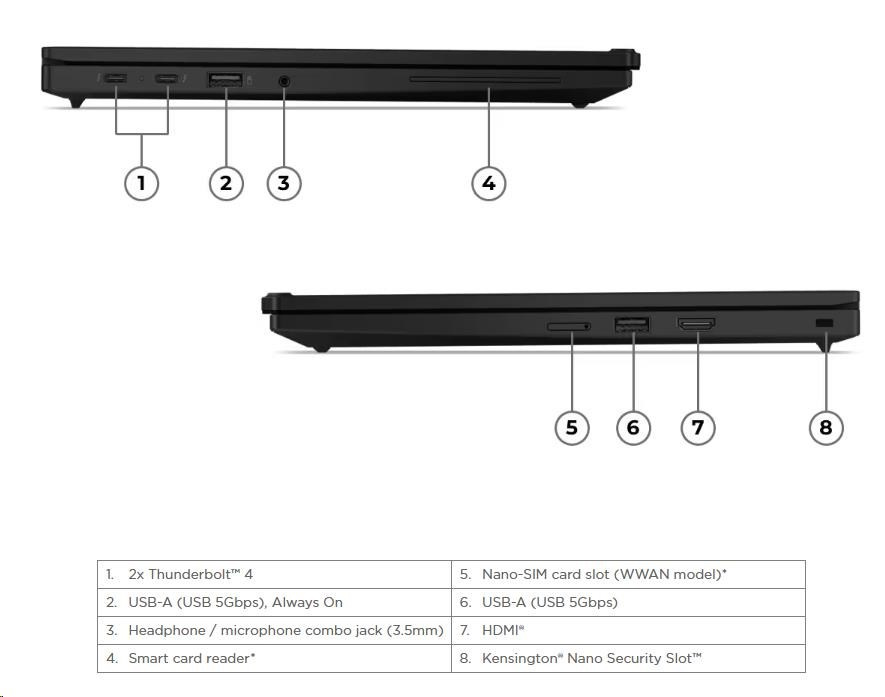 | Standartné porty | 2x USB-A (USB 5Gbps / USB 3.2 Gen 1), one Always On 2x USB-C® (Thunderbolt™ 4 / USB4® 40Gbps), with USB PD 3.1 and DisplayPort™ 2.1 1x HDMI® 2.1, up to 4K/60Hz 1x Headphone / microphone combo jack (3.5mm) |