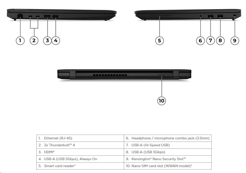 | Standartné porty | 1x USB-A (Hi-Speed USB / USB 2.0) 2x USB-A (USB 5Gbps / USB 3.2 Gen 1), one Always On 2x USB-C® (Thunderbolt™ 4 / USB4® 40Gbps), with USB PD 3.1 and DisplayPort™ 2.1 1x HDMI® 2.1, up to 4K/60Hz 1x Headphone / microphone combo jack (3.5mm) 1x Ethernet (RJ-45) |