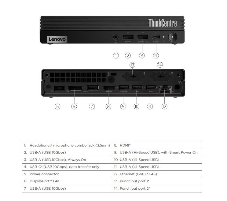 | Predné porty | 1x USB-C® (USB 10Gbps / USB 3.2 Gen 2), data transfer only 1x USB-A (USB 10Gbps / USB 3.2 Gen 2), with Always On and 5V@2.1A charging 1x USB-A (USB 10Gbps / USB 3.2 Gen 2) 1x headphone / microphone combo jack (3.5mm) |