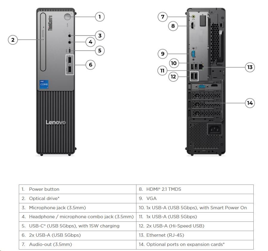 | Zadné porty | 2x USB-A (Hi-Speed USB / USB 2.0) 2x USB-A (USB 5Gbps / USB 3.2 Gen 1), one supports Smart Power On 1x HDMI® 2.1 TMDS 1x VGA 1x Ethernet (RJ-45) 1x line-out (3.5mm) |