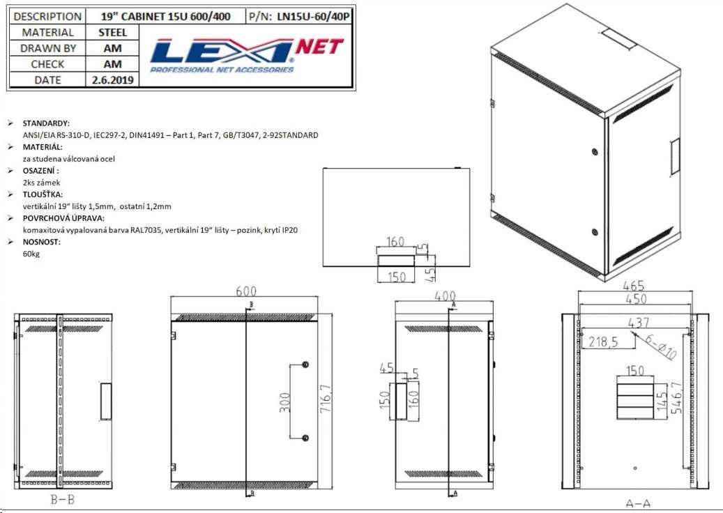 LEXI-Net rack 9U, plný plech, hĺbka 400 mm - ŠTANDARDY: ANSI/EIA RS-310-D, IEC297-2, DIN41491 - časť 1, časť 7, GB/T3047, 2-92STANDARD - MATERIÁL: oceľ valcovaná za studena - UPEVNENIE : 1ks zámok - PLECH: vertikálne 19" koľajnice 1,5 mm, ostatné 1,2 mm - povrchová úprava: komaxitová zapečená farba RAL7035, vertikálne 19" koľajnice - pozinkované - NOSNOSNOSŤ: 60 kg ROZMER: Š x V x H 600x455x400 mm..