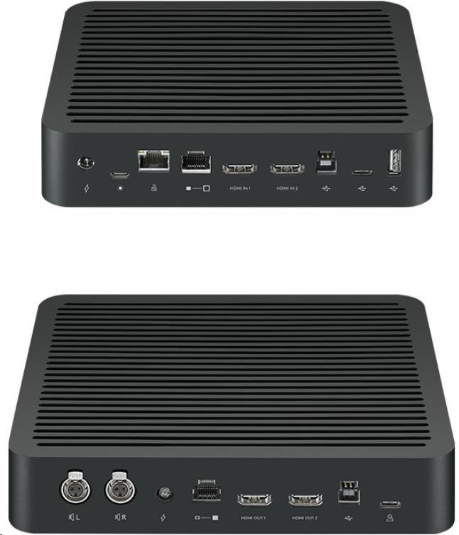 | Rozdeľovač pracovnej plochy Rally | Pripojenie jedným káblom CAT6A k videorozbočovaču Rally (5 m kábel je súčasťou dodávky; kompatibilný s káblami dodanými používateľom do dĺžky 50 m) Aktívna detekcia reproduktorov: analýza zvuku až zo 7 stolových mikrofónov a 56 lúčov každých 8 ms 12-pinový konektor pre stolový mikrofón Rally Pripojenie HDMI typu A k videorozbočovaču (x2) USB typu C USB typu A (vyhradené pre budúce funkcie) USB typu B (pripojenie k počítaču v rokovacej miestnosti) RJ45 (vyhradené pre budúce funkcie) Vstup napájania |