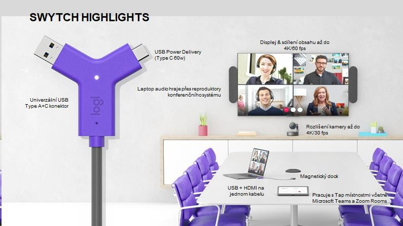 Vďaka inovatívnemu dizajnu, ktorý zaručuje maximálnu kompatibilitu a využíva technológiu DisplayLink® Plug-and-Display, umožňuje Logitech Swytch jediným káblom pripojiť notebook ku konferenčnej kamere a displeju v miestnosti, čo tímom umožňuje jednoducho konferenčniť, prezentovať a streamovať prostredníctvom akejkoľvek služby.