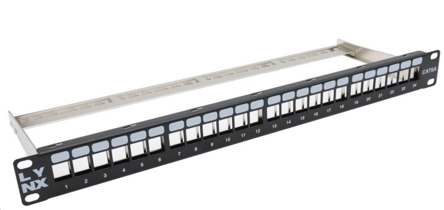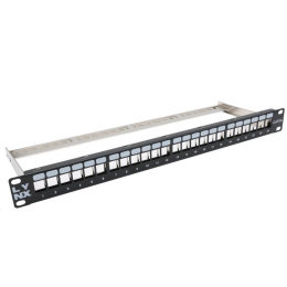 Patch panel 1U/19", 24 otvorov, neosadený, pre tienené keystony, kategória Cat5e/6/6A/7, čierny (predný panel).