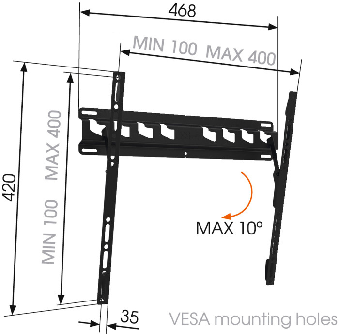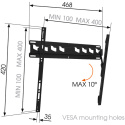 Hlavní vlastnosti: - doporučená úhlopříčka 32-65" - nosnost 40 kg - nastavitelný náklon 0-10° - vzdálenost TV od stěny v poloze u stěny 35 mm - univerzální uchycení VESA 100x100 až 400x400 - nastavitelný náklon až 10 stupňů - jednoduchá montáž - veškerý potřebný montážní materiál je součástí balení