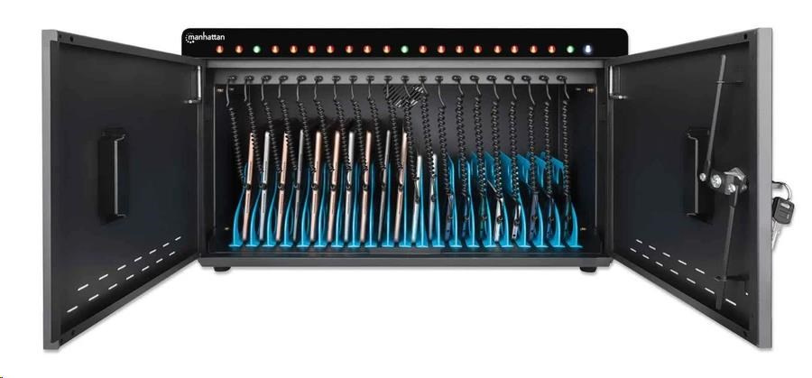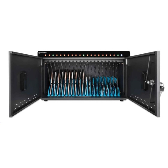 Popis Stolná nabíjacia skrinka MANHATTAN - 20 portov, 360 W, prepäťová ochrana, tiché vetranie, kovový kryt, čierna