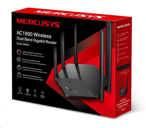 | Balenie obsahuje | • AC1900 Wireless Dual Band Gigabit Router (MR50G) • Napájací adaptér • Ethernetový kábel • Rýchly štartovací návod |