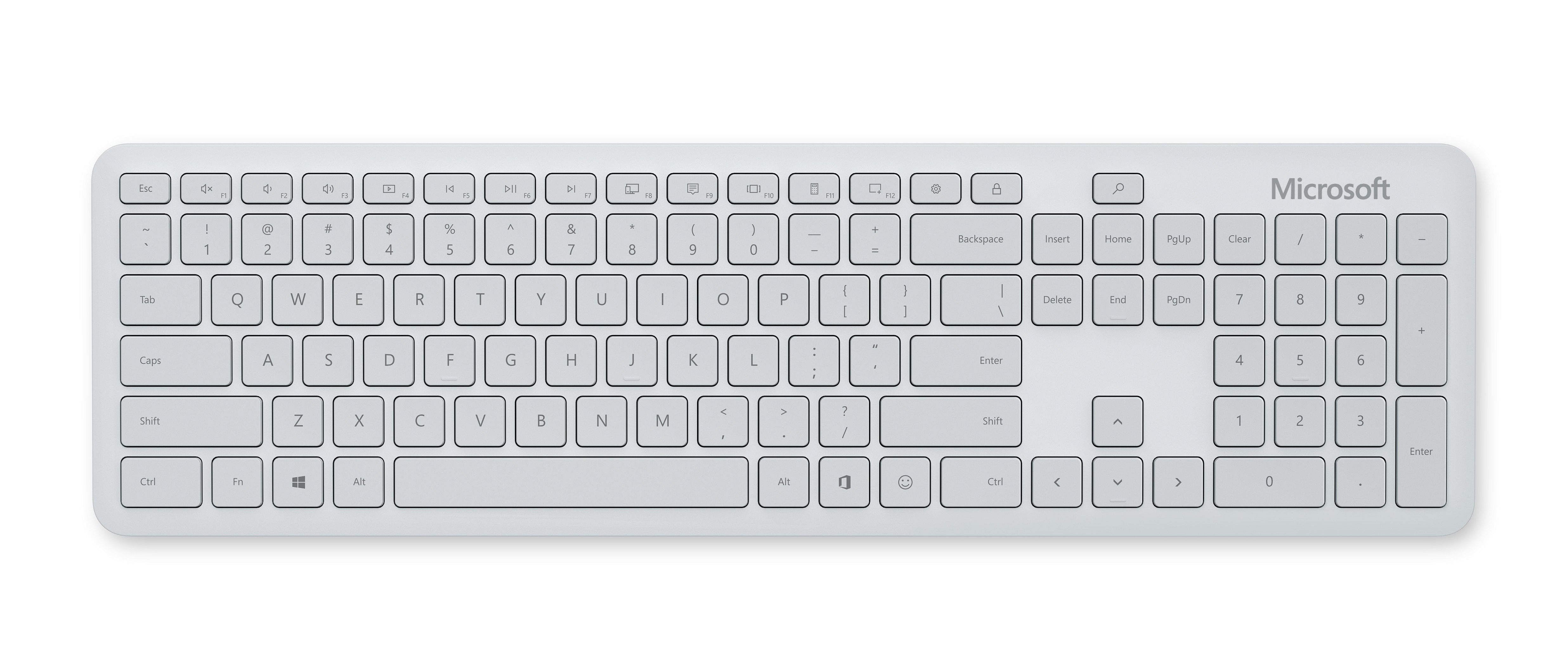 Ušetřete čas a buďte produktivnější Microsoft Bluetooth®Keyboard nabízí integrované funkční klávesy, včetně vyhrazené klávesy pro Office, hledání a emoji a snadný přístup k ovládání multimédií, aplikacím, výstřižkům obrazovky, kalkulačce, hlasitosti a dalším funkcím. Funkce kláves pro Office a emoji je také možné nastavit pomocí nástroje Centrum myši a klávesnice.