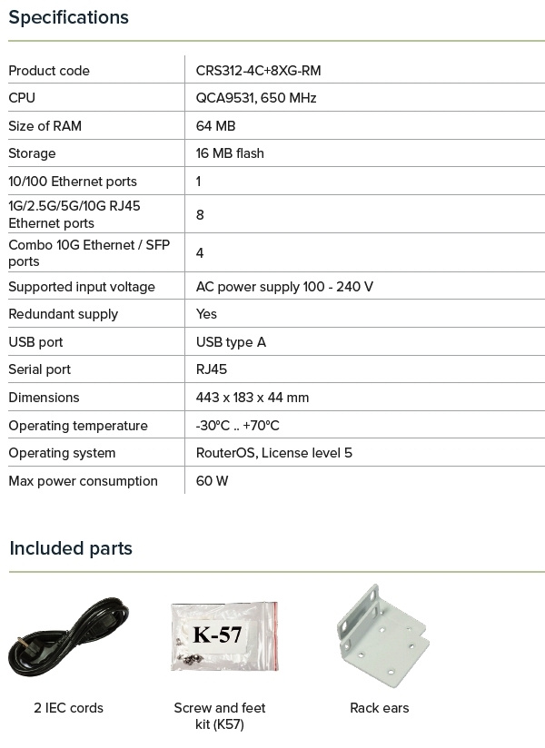 Technické specifikace: Product code: CRS312-4C+8XG-RM CPU: QCA9531, 650 MHz Size of RAM: 64 MB Storage: 16 MB flash 10/100 Ethernet ports: 1 1G/2.5G/5G/10G RJ45 Ethernet ports: 8 Combo 10G Ethernet / SFP ports: 4 Supported input voltage AC power supply: 100 - 240 V Redundant supply: Yes USB port USB type: A Serial port: RJ45 Dimensions: 443 x 183 x 44 mm Operating temperature: -30°C .. +70°C Operating system: RouterOS, license level 5 Max power consumption: 60 W